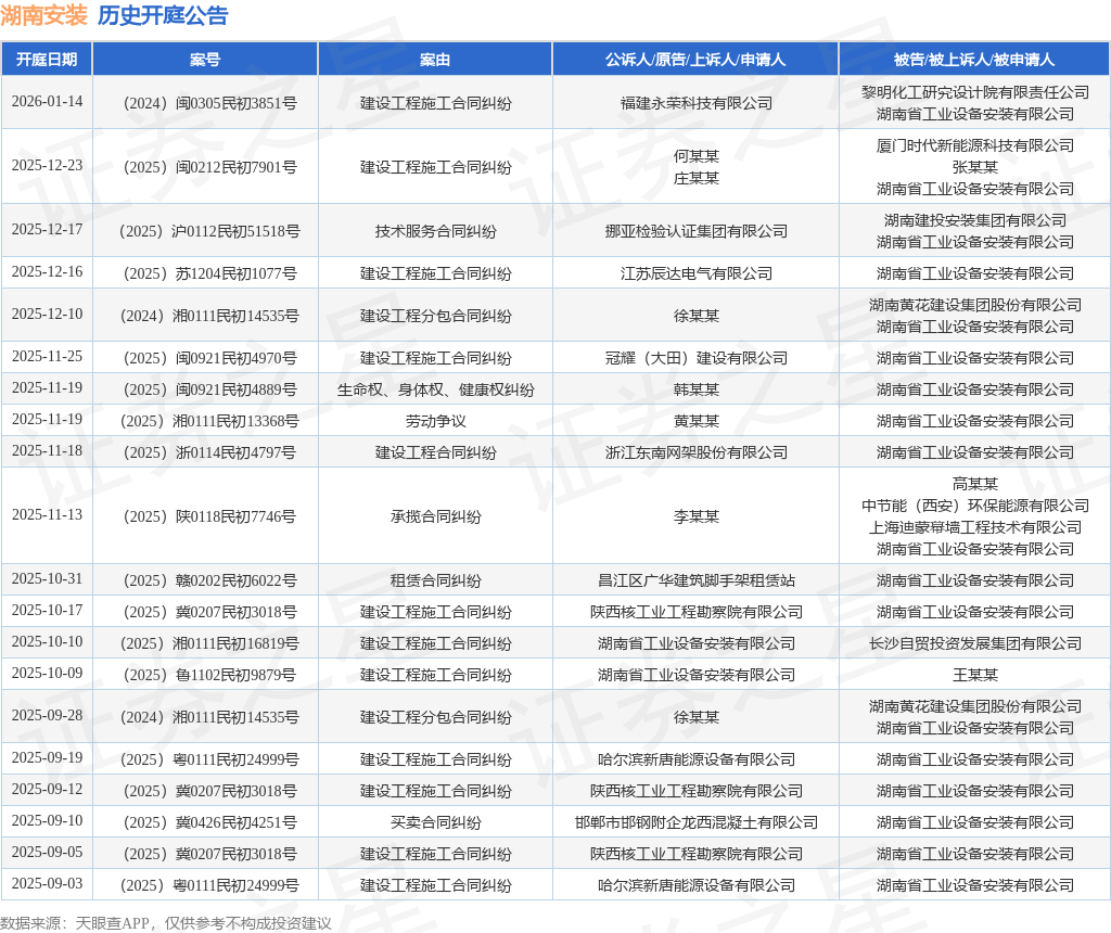 案号:(2024)闽0305民初3851号根据统计,近一年内以湖南省工业设备安装有限公司为当事人的历史开庭公告有59则,其中案由为“建设工程施工合同纠纷”的公告以26则居首,其次为“建设工程合同纠纷”有6则,“劳动争议”有5则。历史开庭公告(前20条)如下: