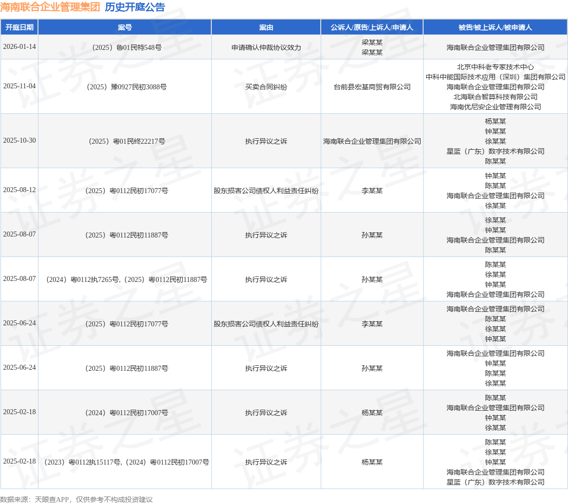 案号:(2025)鲁01民特548号根据统计,近一年内以海南联合企业管理集团有限公司为当事人的历史开庭公告有10则,其中案由为“执行异议之诉”的公告以6则居首,其次为“股东损害公司债权人利益责任纠纷”有2则,“买卖合同纠纷”有1则。历史开庭公告如下: