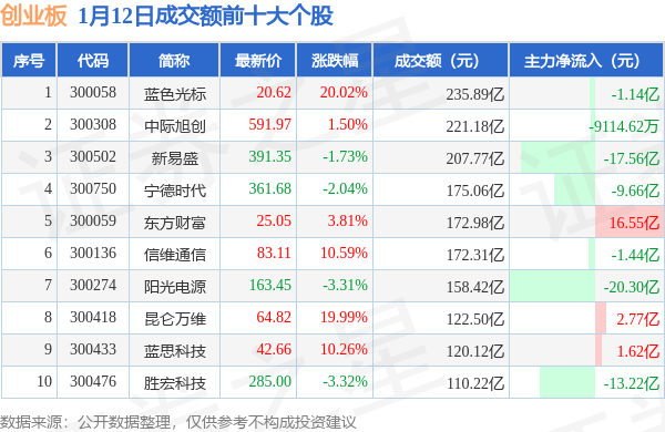 当日创业板成交额前10大个股中6只个股收涨,平均涨幅11.03%,其中蓝色光标(300058)以成交额235.89亿元排第一。从主力资金流入看,成交额前10大个股中有3只个股呈现主力资金净流入。