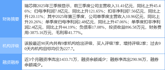 2025年10月29日,民生证券研究员方竞,蔡濠宇发布了对瑞芯微的研报《2025年三季报点评:AIoT创新助推发展,SoC+协处理器布局共进》,该研报对瑞芯微给出“买入”评级。研报中预计公司2025-2027年归母净利润为11.06/14.31/18.39亿元,对应PE为73/56/44倍,我们看好公司在机器视觉、汽车电子等市场产品持续放量,后续业绩增长具备持续性,维持“推荐”评级。证券之星数据中心根据近三年发布的研报数据计算,该研报作者对此股的盈利预测准确度为79.75%。