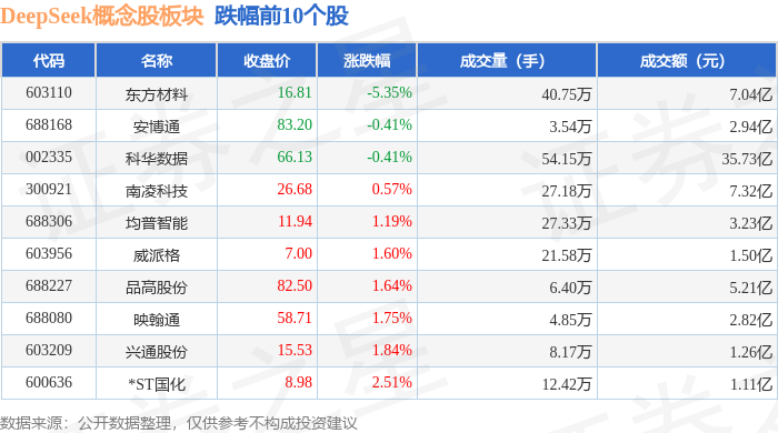 从资金流向上来看,当日DeepSeek概念股板块主力资金净流入65.82亿元,游资资金净流出44.58亿元,散户资金净流出21.24亿元。DeepSeek概念股板块个股资金流向见下表: