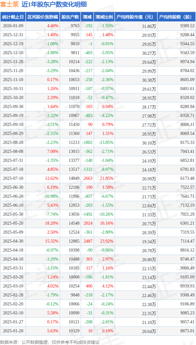 从股价来看,2025年12月31日至2026年1月9日,富士莱区间涨幅为4.4%,在此期间股东户数减少192.0户,减幅为1.93%。