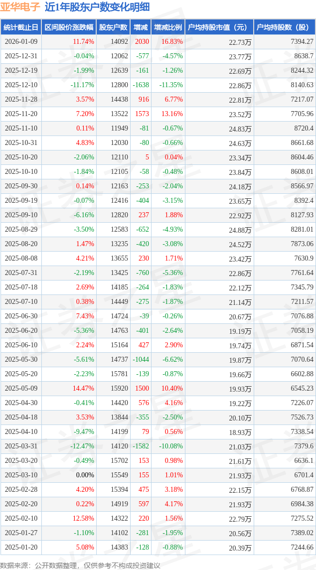从股价来看,2025年12月31日至2026年1月9日,亚华电子区间涨幅为11.74%,在此期间股东户数增加2030.0户,增幅为16.83%。