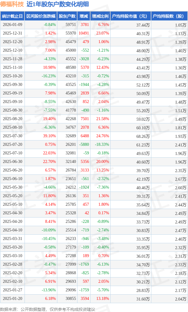 证券之星消息,近日德福科技披露,截至2026年1月9日公司股东户数为5.98万户,较12月31日增加3781.0户,增幅为6.76%。户均持股数量由上期的1.13万股减少至1.05万股,户均持股市值为37.44万元。