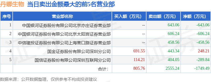 证券之星消息,沪深交易所2026年1月12日公布的交易公开信息显示,丹娜生物(920009)因当日换手率达到20%的前5只股票登上龙虎榜。此次是近5个交易日内第1次上榜。