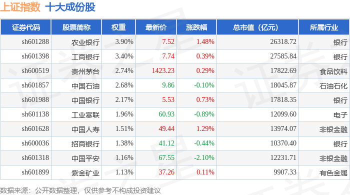 上证指数(000001)十大成份股详情如下: