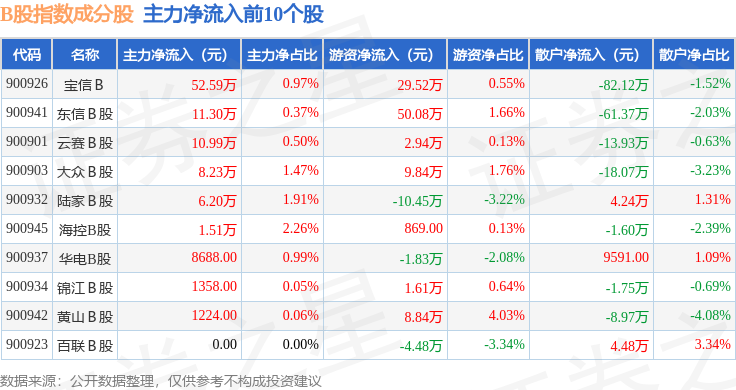 资金流向方面,B股指数(000003)成份股当日主力资金净流出合计69.51万元,游资资金净流出合计140.5万元,散户资金净流入合计210.01万元。成份股资金流向详情见下表:
