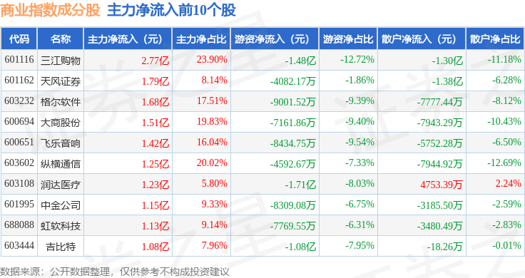 资金流向方面,商业指数(000005)成份股当日主力资金净流入合计5.62亿元,游资资金净流出合计11.56亿元,散户资金净流入合计5.94亿元。成份股资金流向详情见下表: