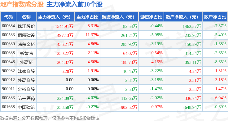 资金流向方面,地产指数(000006)成份股当日主力资金净流出合计4.35亿元,游资资金净流入合计1.36亿元,散户资金净流入合计2.99亿元。成份股资金流向详情见下表: