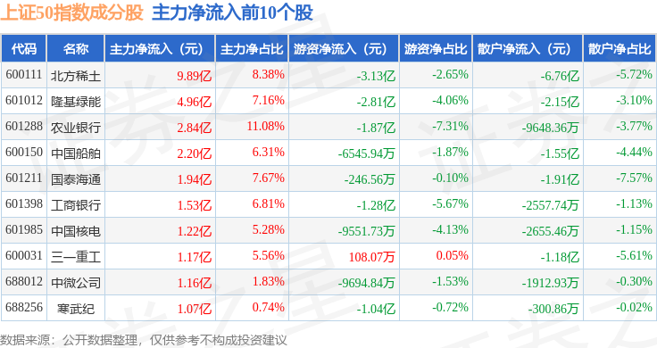 资金流向方面,上证50(000016)指数成份股当日主力资金净流出合计47.08亿元,游资资金净流入合计13.68亿元,散户资金净流入合计33.4亿元。成份股资金流向详情见下表: