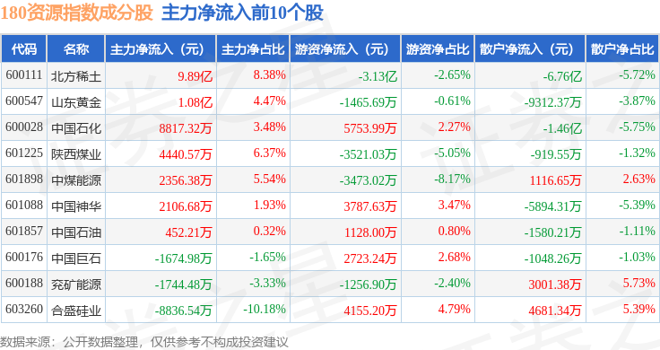 资金流向方面,180资源(000026)指数成份股当日主力资金净流出合计22.65亿元,游资资金净流入合计4.72亿元,散户资金净流入合计17.93亿元。成份股资金流向详情见下表: