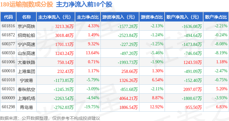 资金流向方面,180运输(000027)指数成份股当日主力资金净流出合计1.59亿元,游资资金净流入合计8864.61万元,散户资金净流入合计6988.68万元。成份股资金流向详情见下表: