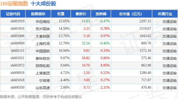 180运输(000027)指数十大成份股详情如下: