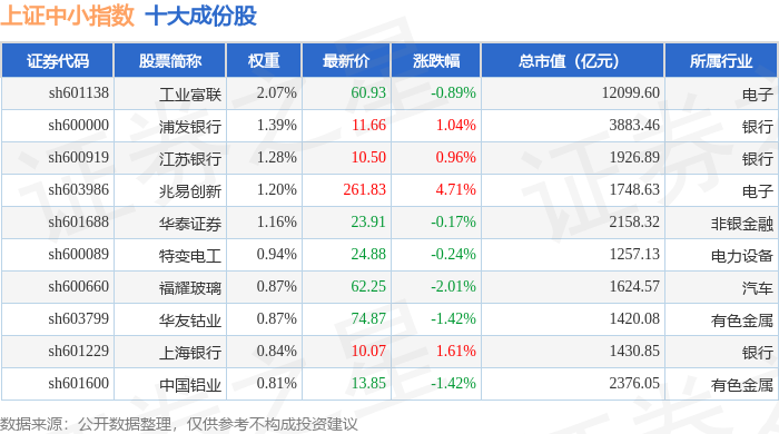 证券之星消息,1月12日,上证中小(000046)指数报收于5451.66点,涨1.33%,成交6045.46亿元,换手率1.87%。当日该指数成份股中,上涨的有308家,中科星图以20.0%的涨幅领涨,下跌的有123家,源杰科技以5.98%的跌幅领跌。