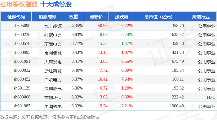 证券之星消息,1月12日,公用等权(000079)指数报收于2617.76点,涨1.03%,成交184.79亿元,换手率1.03%。当日该指数成份股中,上涨的有21家,九丰能源以9.22%的涨幅领涨,下跌的有6家,京能电力以1.47%的跌幅领跌。