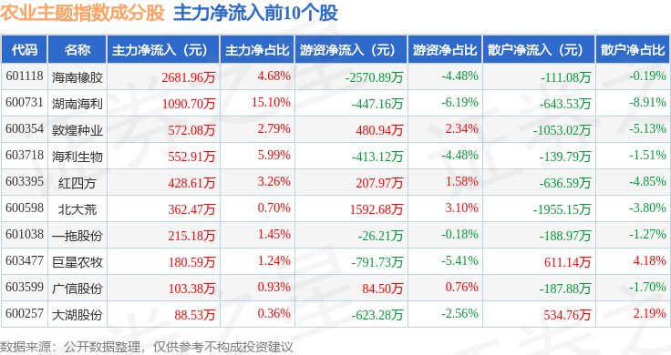 资金流向方面,农业主题(000122)指数成份股当日主力资金净流出合计1.63亿元,游资资金净流入合计5628.05万元,散户资金净流入合计1.06亿元。成份股资金流向详情见下表: