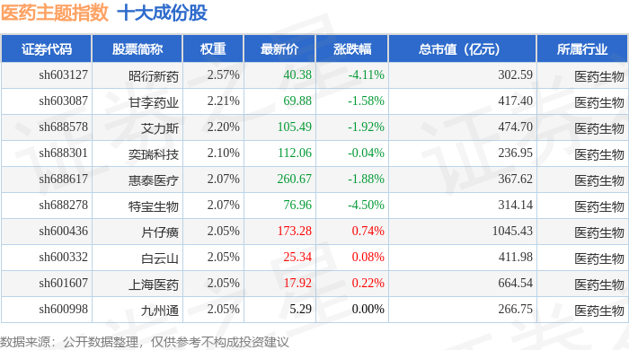 医药主题(000121)指数十大成份股详情如下: