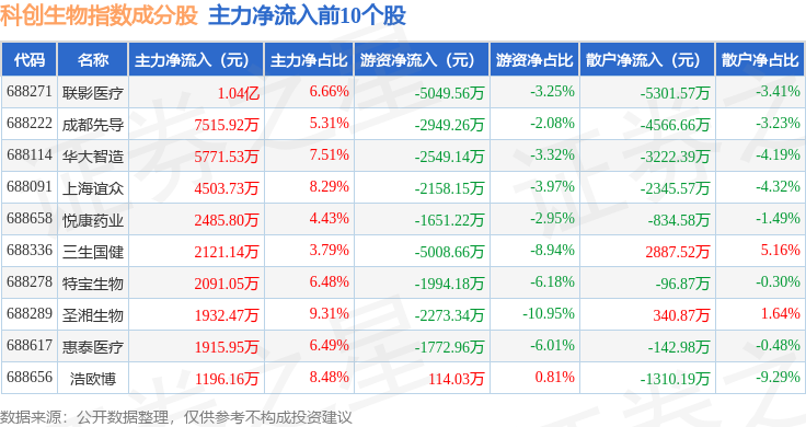 资金流向方面,科创生物(000683)指数成份股当日主力资金净流出合计7365.12万元,游资资金净流出合计9823.2万元,散户资金净流入合计1.72亿元。成份股资金流向详情见下表: