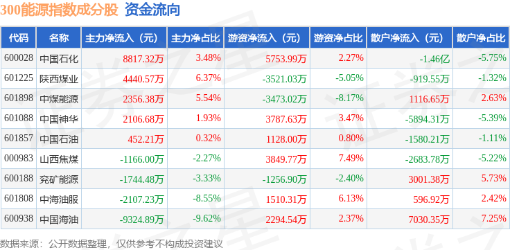 资金流向方面,300能源(000908)指数成份股当日主力资金净流入合计3830.57万元,游资资金净流入合计1.01亿元,散户资金净流出合计1.39亿元。成份股资金流向详情见下表: