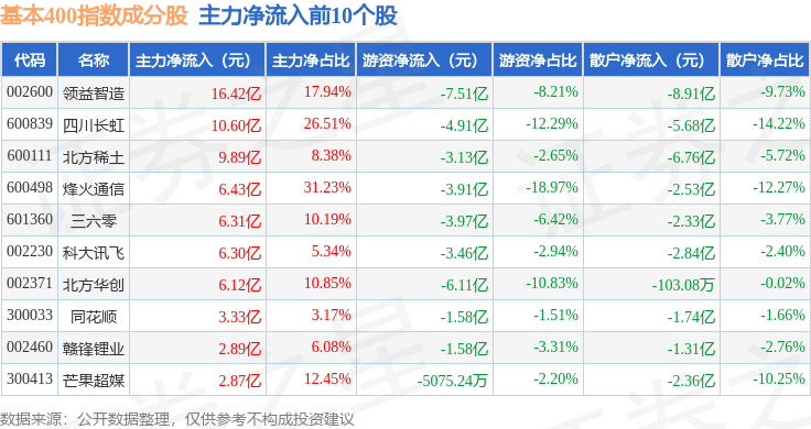资金流向方面,基本400(000966)指数成份股当日主力资金净流出合计116.27亿元,游资资金净流入合计19.94亿元,散户资金净流入合计96.33亿元。成份股资金流向详情见下表: