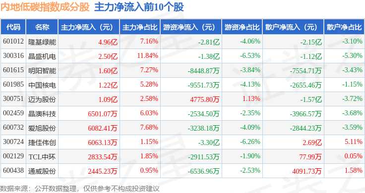资金流向方面,内地低碳(000977)指数成份股当日主力资金净流出合计80.49亿元,游资资金净流入合计17.64亿元,散户资金净流入合计62.69亿元。成份股资金流向详情见下表: