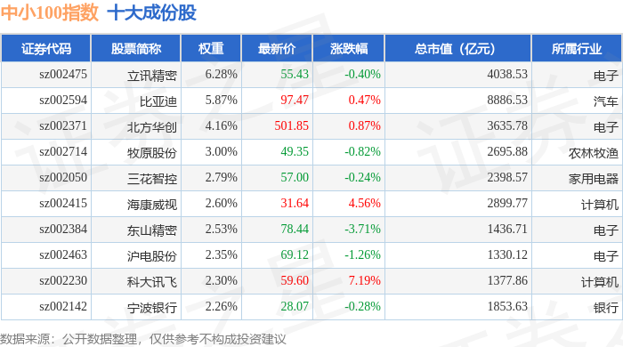 中小100(399005)指数十大成份股详情如下: