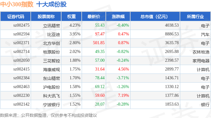 中小300(399008)指数十大成份股详情如下:
