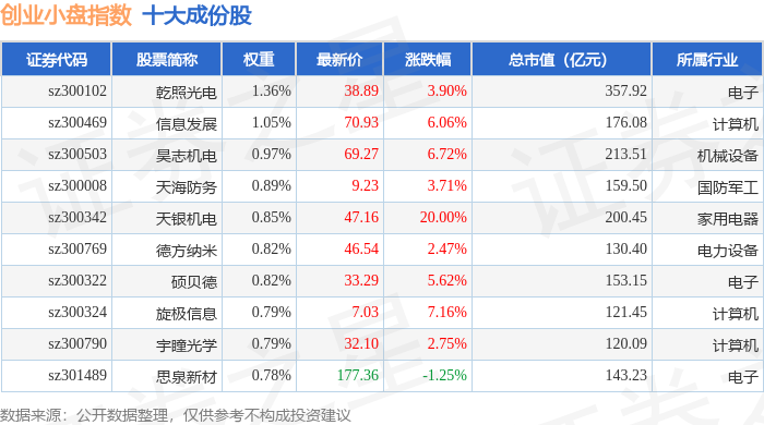 证券之星消息,1月12日,创业小盘(399020)指数报收于1998.92点,涨4.21%,成交1914.95亿元,换手率8.7%。当日该指数成份股中,上涨的有262家,中泰股份以20.02%的涨幅领涨,下跌的有36家,武汉天源以10.53%的跌幅领跌。