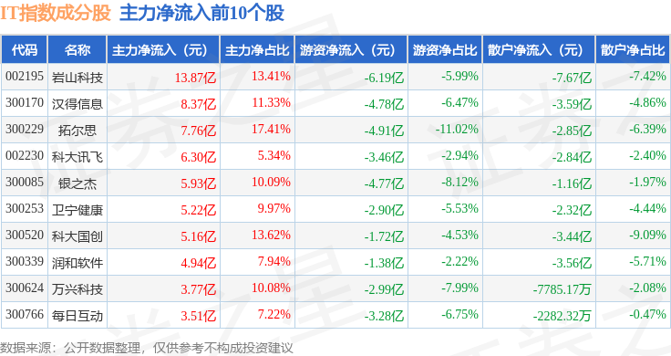 资金流向方面,IT指数(399239)成份股当日主力资金净流入合计129.78亿元,游资资金净流出合计73.41亿元,散户资金净流出合计56.37亿元。成份股资金流向详情见下表: