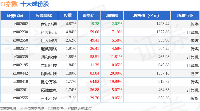 证券之星消息,1月12日,IT指数(399239)报收于2437.51点,涨7.78%,成交3312.96亿元,换手率10.84%。当日该指数成份股中,上涨的有238家,拓尔思以20.02%的涨幅领涨,下跌的有8家,新迅达以5.52%的跌幅领跌。