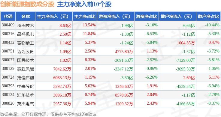 资金流向方面,创新能源(399266)指数成份股当日主力资金净流出合计56.26亿元,游资资金净流入合计13.79亿元,散户资金净流入合计42.47亿元。成份股资金流向详情见下表: