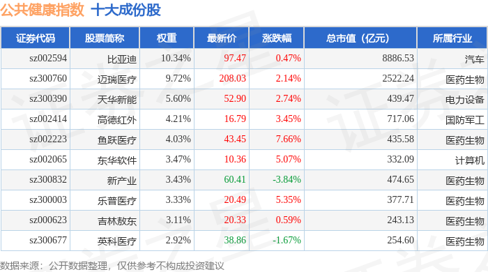 公共健康(399277)指数十大成份股详情如下: