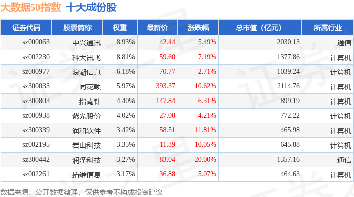 大数据50(399282)指数十大成份股详情如下: