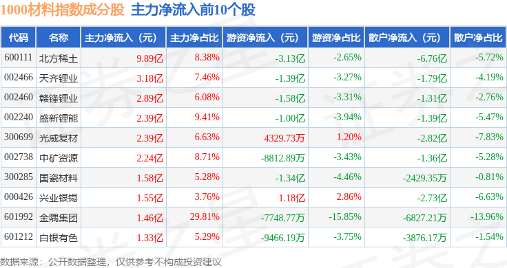 资金流向方面,1000材料(399382)指数成份股当日主力资金净流出合计62.92亿元,游资资金净流入合计13.95亿元,散户资金净流入合计48.97亿元。成份股资金流向详情见下表: