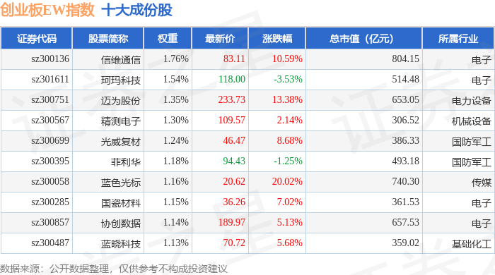 证券之星消息,1月12日,创业板EW(399635)指数报收于2452.8点,涨3.65%,成交3845.64亿元,换手率6.13%。当日该指数成份股中,上涨的有71家,蓝色光标以20.02%的涨幅领涨,下跌的有29家,万辰集团以5.36%的跌幅领跌。