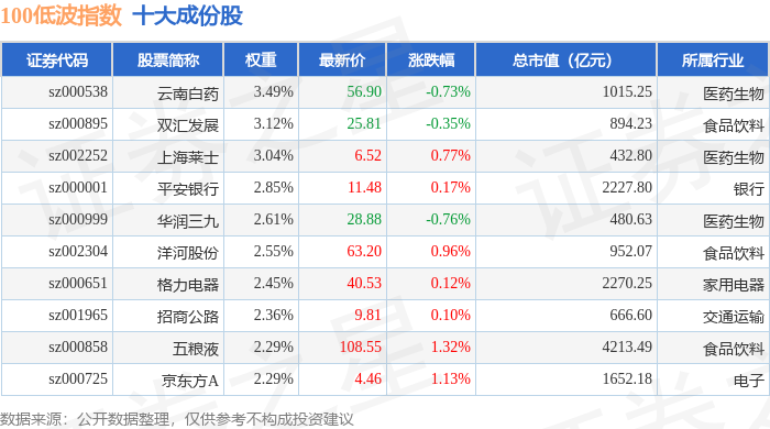 100低波(399645)指数十大成份股详情如下: