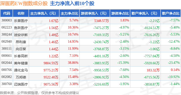 资金流向方面,深医药EW(399676)指数成份股当日主力资金净流出合计7.03亿元,游资资金净流出合计2.02亿元,散户资金净流入合计9.05亿元。成份股资金流向详情见下表: