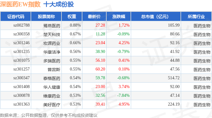 证券之星消息,1月12日,深医药EW(399676)指数报收于4083.93点,涨1.71%,成交877.05亿元,换手率3.38%。当日该指数成份股中,上涨的有156家,华兰股份以19.99%的涨幅领涨,下跌的有59家,维康药业以7.84%的跌幅领跌。
