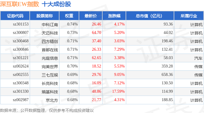 证券之星消息,1月12日,深互联EW(399677)指数报收于6611.86点,涨7.65%,成交2614.92亿元,换手率11.17%。当日该指数成份股中,上涨的有162家,拓尔思以20.02%的涨幅领涨,下跌的有4家,佳创视讯以2.37%的跌幅领跌。