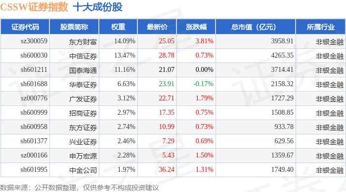 CSSW证券(399707)指数十大成份股详情如下: