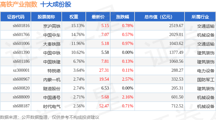 高铁产业(399807)指数十大成份股详情如下: