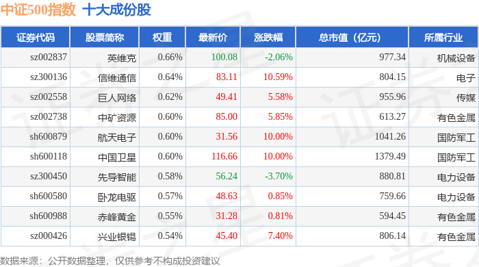 中证500(399905)指数十大成份股详情如下: