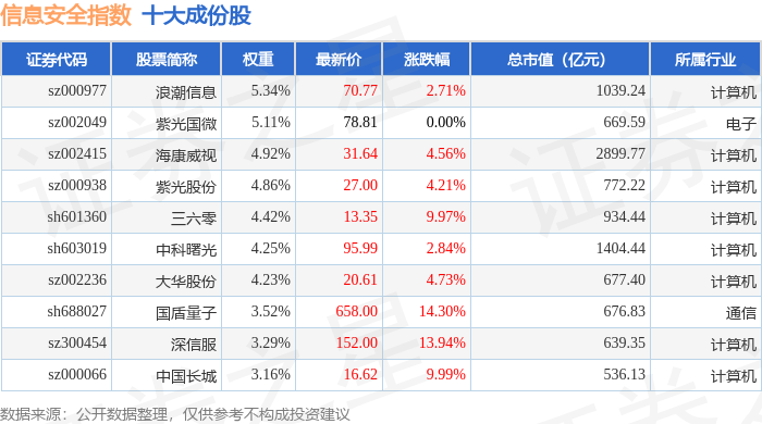 信息安全(399994)指数十大成份股详情如下: