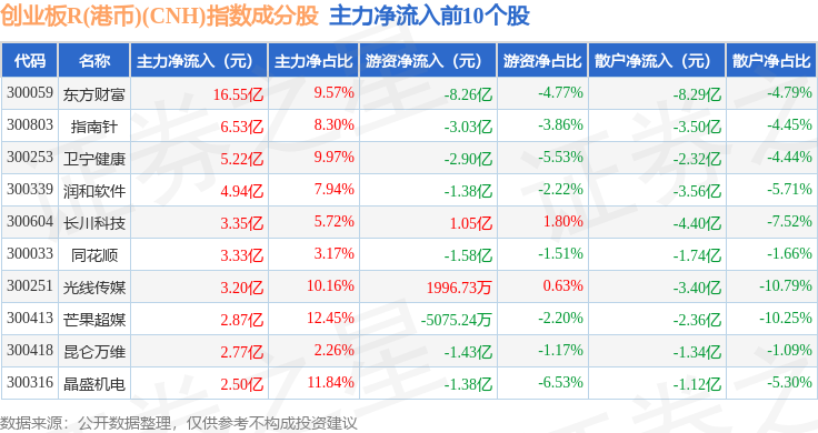 资金流向方面,创业板R(港币)(CNH)(470006)指数成份股当日主力资金净流出合计33.41亿元,游资资金净流入合计6.84亿元,散户资金净流入合计26.57亿元。成份股资金流向详情见下表: