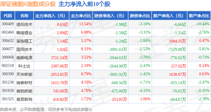资金流向方面,深证储能R(470036)指数成份股当日主力资金净流出合计86.35亿元,游资资金净流入合计23.0亿元,散户资金净流入合计63.35亿元。成份股资金流向详情见下表: