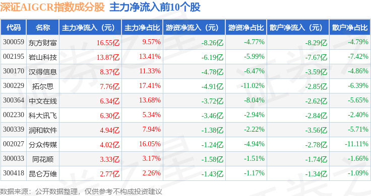 资金流向方面,深证AIGCR(470075)指数成份股当日主力资金净流入合计92.06亿元,游资资金净流出合计46.29亿元,散户资金净流出合计45.77亿元。成份股资金流向详情见下表: