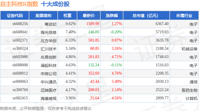 自主科技R(480033)指数十大成份股详情如下: