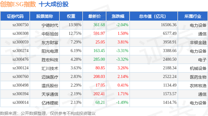 资金流向方面,创指ESG(970028)指数成份股当日主力资金净流出合计25.57亿元,游资资金净流出合计6053.76万元,散户资金净流入合计26.18亿元。成份股资金流向详情见下表: