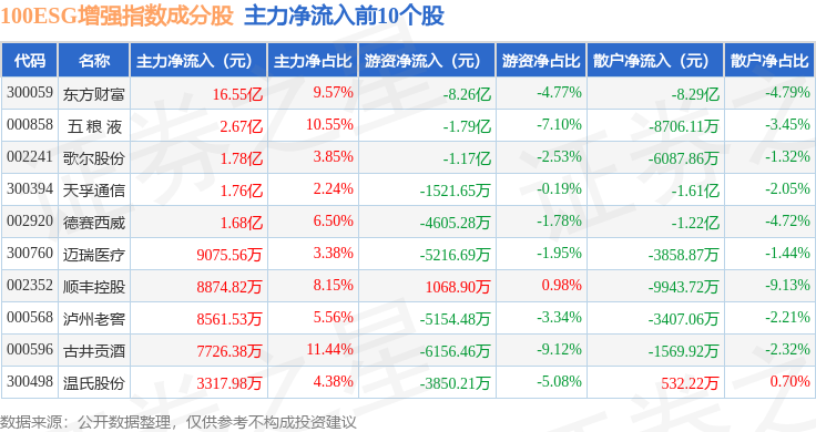 资金流向方面,100ESG增强(970033)指数成份股当日主力资金净流出合计49.24亿元,游资资金净流入合计8.0亿元,散户资金净流入合计41.23亿元。成份股资金流向详情见下表: