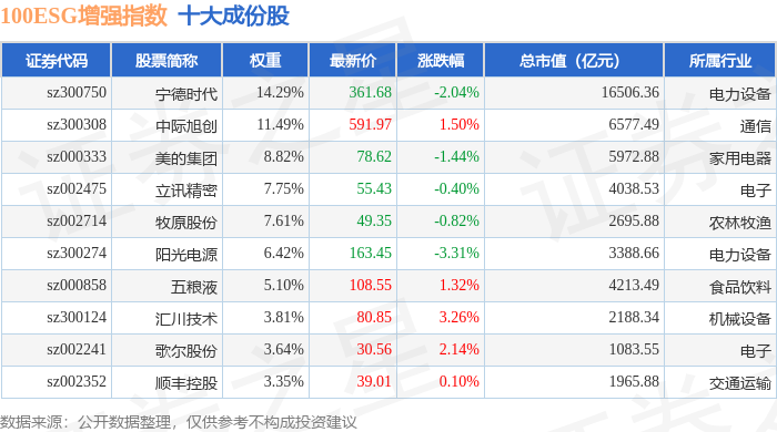 100ESG增强(970033)指数十大成份股详情如下: